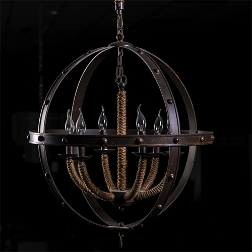 Люстра Dialma Brown изготовлена из шипованного металла, с отделкой под ржавчину и веревочное плетение. Имеет круглую форму, 6 ламп.