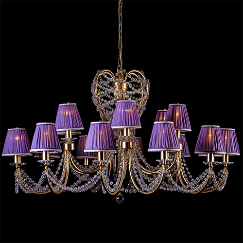 Основание люстры золото, абажуры из тончайшей плиссированной органзы фиолетового цвета с кантом серебристого цвета. Подвески из прозрачного хрусталя Asfour, чашки из прозрачного муранского стекла с огранкой, имеют металлический блеск и всегда будет выглядеть дорого и актуально.